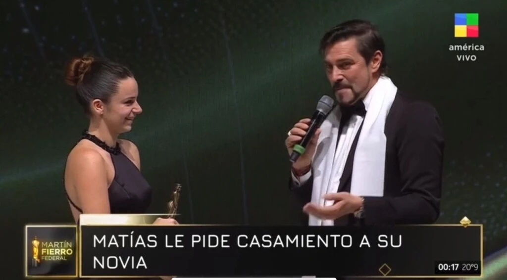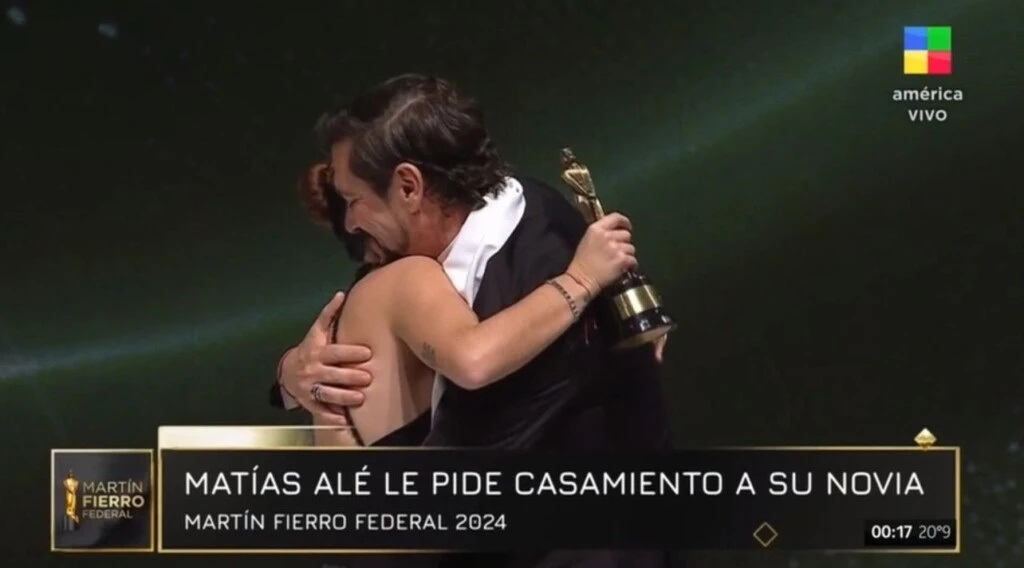 El sábado por la noche se realizó una nueva entrega del Martín Fierro Federal, en Mendoza. Uno de los invitados fue Matías Alé, que estaba ternado a Mejor Labor Masculina. Tras confirmarse que se ganó la estatuilla, el actor sorprendió a todos al proponerle matrimonio a su novia, Martina Vignolo, arriba del escenario.