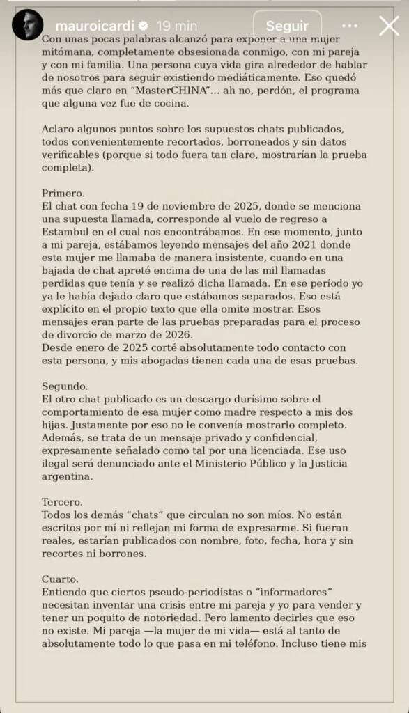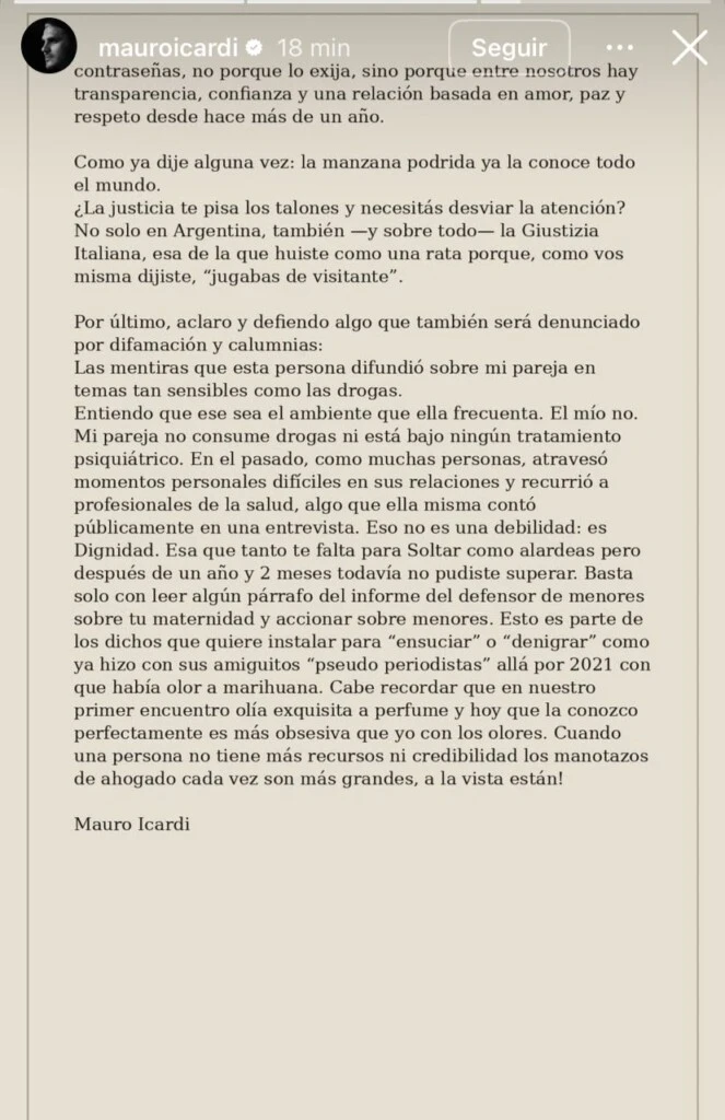 Además, Icardi aseguró que para esa época ya había dejado en claro que la relación estaba terminada. Según su descargo, esa situación figura de manera explícita en mensajes que, según él, Wanda decidió no mostrar en las capturas compartidas públicamente. “Eso está explícito en el propio texto que ella omite mostrar”, afirmó.