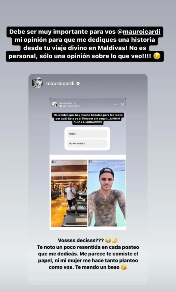Luego, Wanda subió una imagen con una romántica canción que eligió para musicalizar uno de los primeros posteos que subió desde Maldivas. El tema es “Te quiero decir” del rapero 55 Problem. “Lo que te quiero decir es que tu eres tan especial. Vamos a viajar en mi nave espacial, lo que yo siento no es artificial”, expresa la frase que seleccionó.