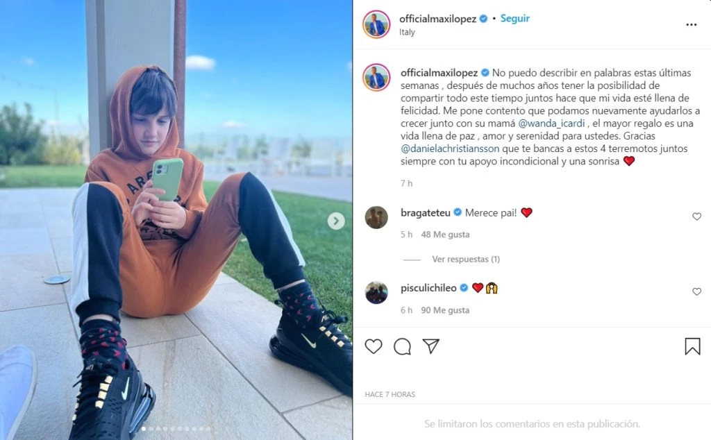 Y agregó: “Me pone contento que podamos nuevamente ayudarlos a crecer junto con su mamá, @wanda_icardi, el mayor regalo es una vida llena de paz, amor y serenidad para ustedes”, destacó en un párrafo especial donde mencionó a la manager futbolística, quien atraviesa una fuerte crisis con Mauro Icardi por su affaire con la China Suárez.