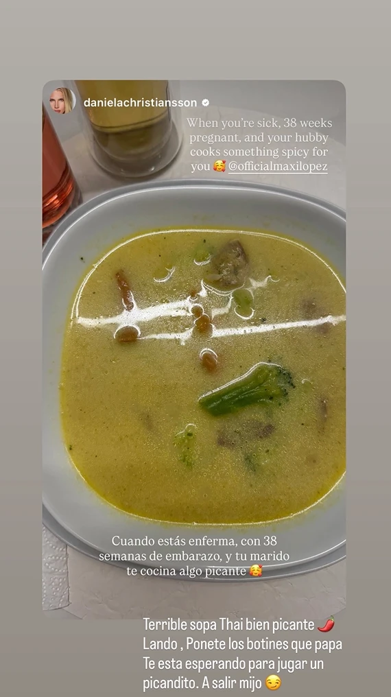 Daniela atraviesa la semana 38 de embarazo y, según reveló, no se siente del todo bien. Para reconfortarla, Maxi preparó una sopa Thai bien picante, una receta que combina sabores intensos y especias típicas de la cocina asiática. La modelo publicó la imagen del plato en sus historias de Instagram junto al texto: “Cuando estás enferma, con 38 semanas de embarazo y tu marido te cocina algo picante”, acompañado de emojis de corazones.