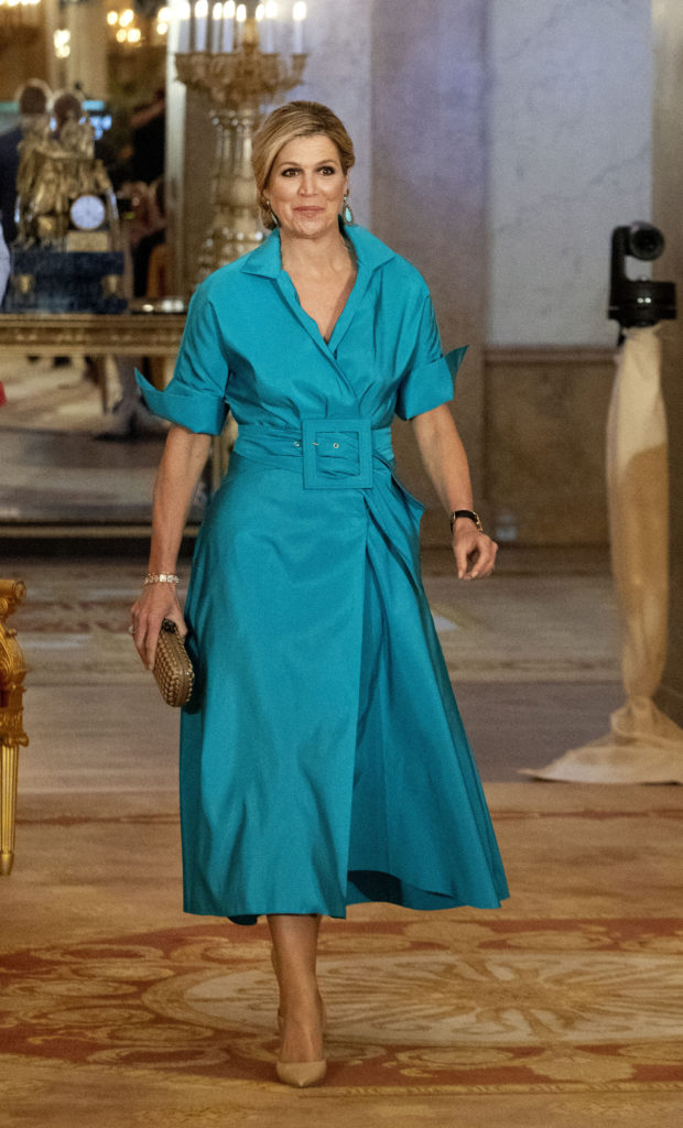 Acompañada por el rey Guillermo Alejandro, Máxima asistió al evento en el palacio de Noordeinde con un impactante diseño en azul turquesa. El diseño, un clásico de Natan a cargo del diseñador belga Edouard Vermeule, es un vestido de estilo camisero con mangas arremangadas, enorme cinturón en el mismo género y con falda midi de línea A, que es sello registrado en sus estilismos.