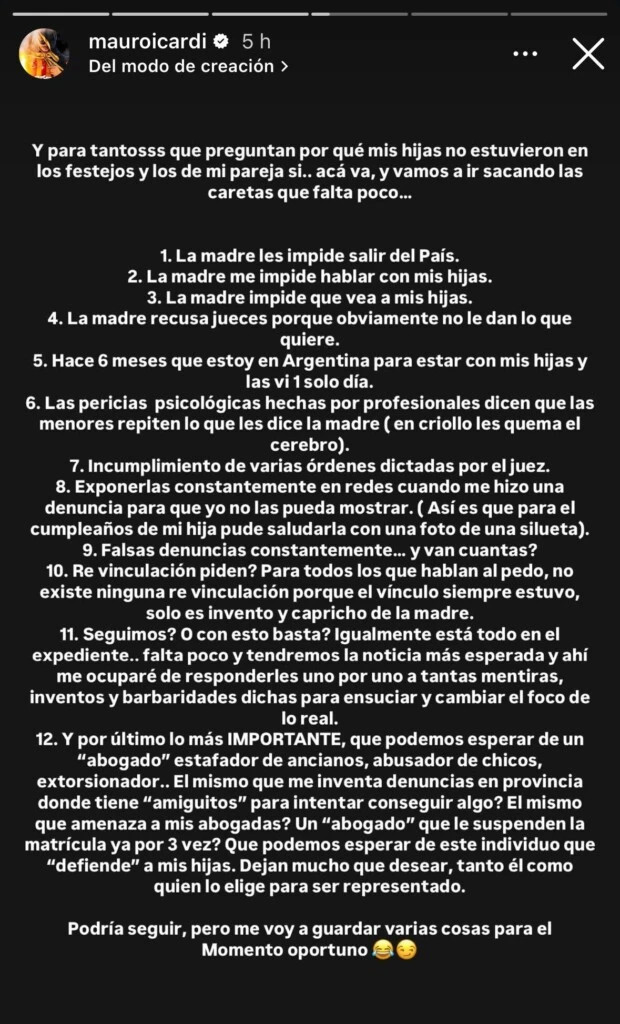 En ese momento, hizo referencia a la situación judicial: "Las pericias psicológicas hechas por profesionales dicen que las menores repiten lo que les dice la madre (en criollo, les quema el cerebro). Incumplimiento de varias órdenes dictadas por el juez. Exponerlas constantemente en redes cuando me hizo una denuncia para que yo no las pueda mostrar, así es que para el cumpleaños de mi hija pude saludarla con una foto de una silueta".