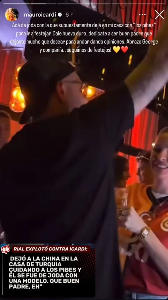 En primer lugar, el futbolista le respondió a Jorge Rial, quién había dicho: "Dejó a la China en la casa de Turquía cuidando a los pibes y él se fue de joda con una modelo, qué buen padre eh". Entonces, Icardi compartió un video del festejo del Galatasaray en el que se lo ve bailando y celebrando con la China.