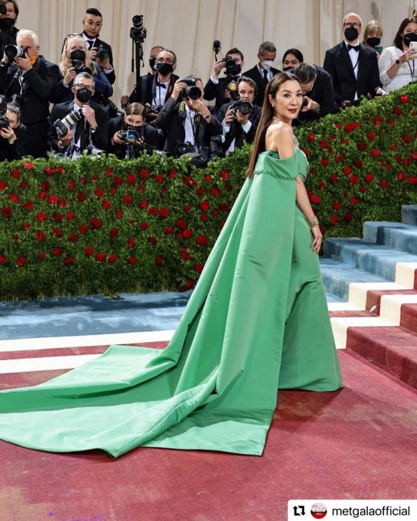 Michelle Yeoh lució un vestido verde y enorme capa, firmado por Atelier Prabal Gurung. Otro diseño que fue reutilizado especialmente para la Gala del MET.
