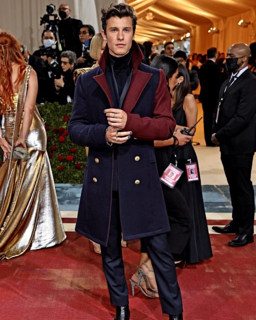 Shawn Mendes fue uno de los pocos invitados que hizo un cambio de look en vivo. Uno de ellos fue con un saco con silueta clásica y masculina, a tono con los colores tradicionales de Tommy Hilfiger -azul marino y rojo guinda-.