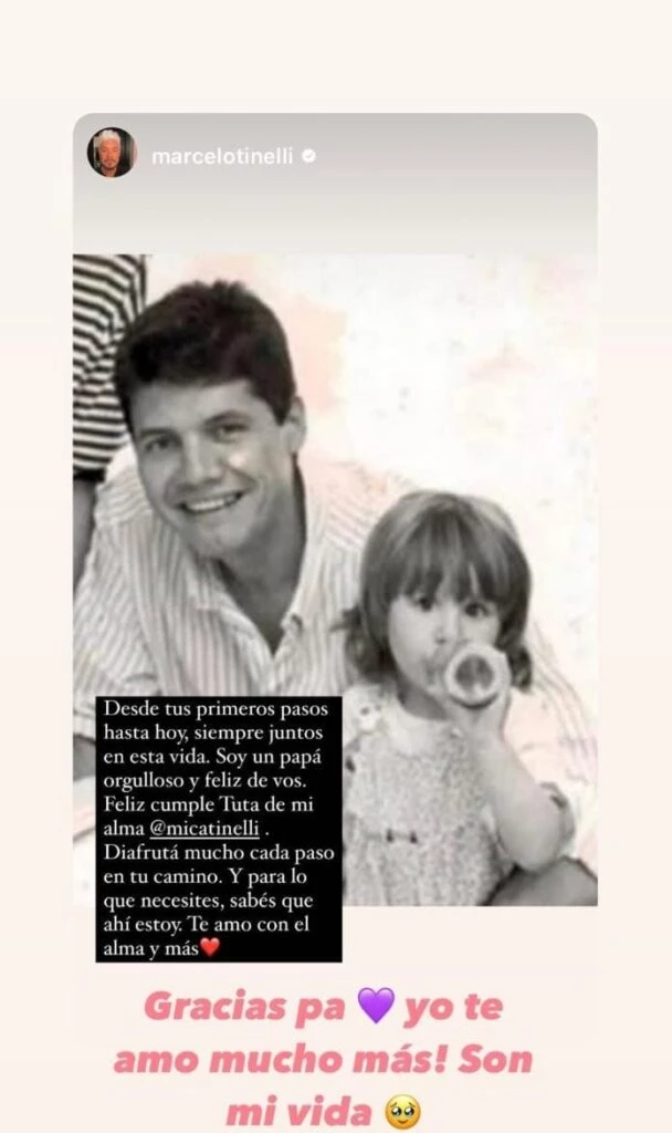 Como no podía ser de otra forma, Marcelo Tinelli festejó con su hija de forma virtual. El conductor compartió una foto vintage hermosa y escribió: "Desde tus primeros pasos hasta hoy, siempre juntos en esta vida soy un papá orgulloso y feliz de vos. Feliz cumple Tuta de mi alma. Disfrutá mucho cada paso y lo que necesites sabés que ahí estoy. Te amo con el alma y más"
