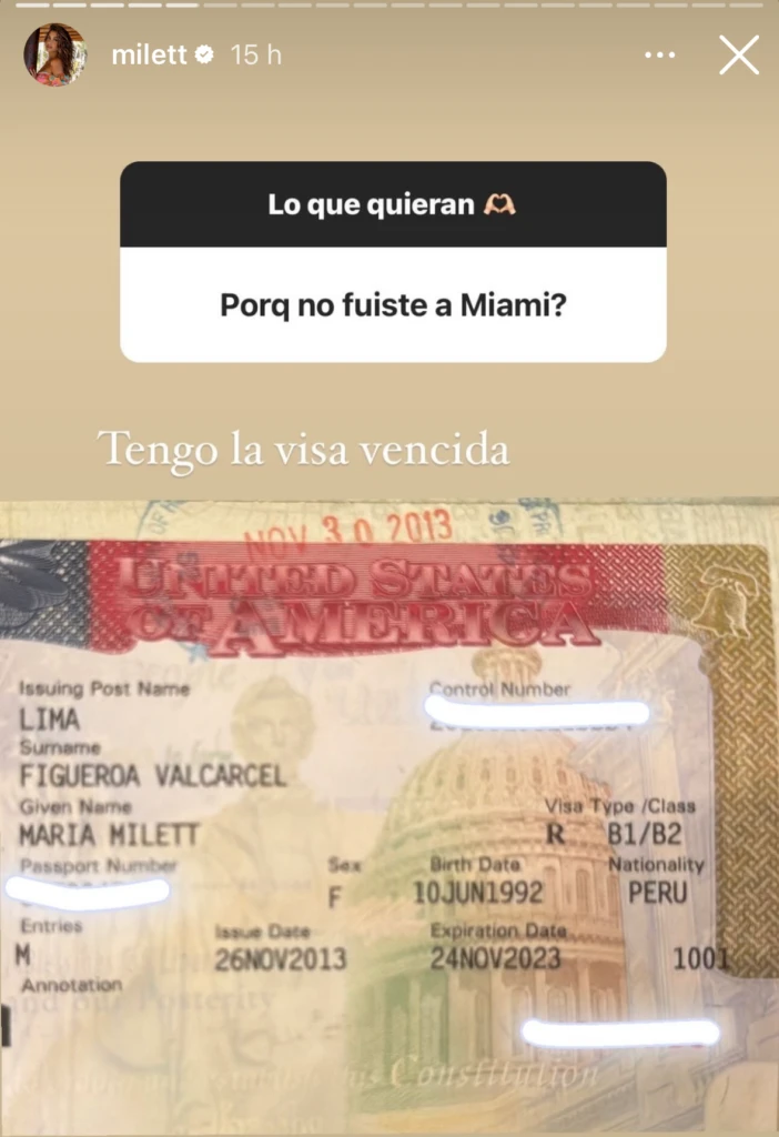 El sábado, la modelo abrió una cajita para que sus seguidores de Instagram le hagan preguntas, y una de las que decidió contestar decía: "¿Por qué no fuiste a Miami?". A lo que Figueroa compartió una imagen de su visa, donde decía que se había vencido en noviembre del 2023, y afirmó: "Tengo la visa vencida".