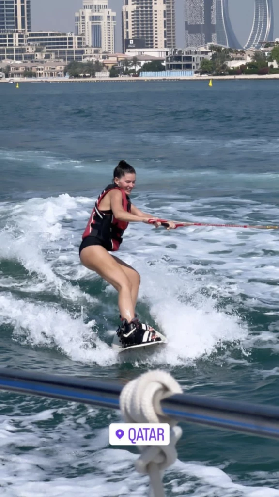 Además, la artista aprovechó su tiempo libre para practicar wakeboard, un deporte acuático muy conocido y con múltiples beneficios para la salud. Posando en un jet privado, luciendo una malla enteriza color negra y chaleco salvavidas, la China se mostró contenta y disfrutando de Doha, una ciudad moderna pero de cultura conservadora.