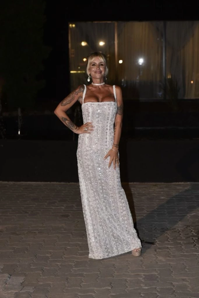 El vestido que utilizó la conductora es una creación de Camila Romano. Vestido con corte sirena, cola y escote profundo y espalda con breteles bordados a mano. El género del vestido es guippiure de algodón con efecto calado. Está confeccionado en transparencia color nude para resaltar los dibujos de la trama y generar un efecto boho para una boda al aire libre, detalló la diseñadora.