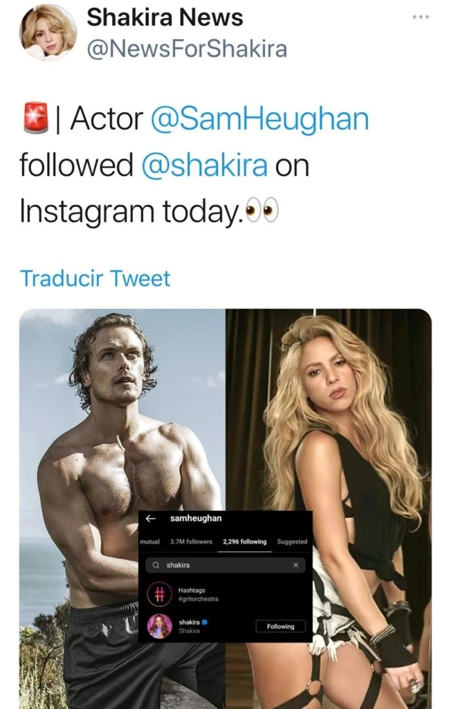 Quien está más asociado a Shakira es el actor Sam Heughan, quien brilló con su actuación en la reconocida serie Outlander. La artista le devolvió el gesto y también comenzó a seguirlo a él en su Instagram.