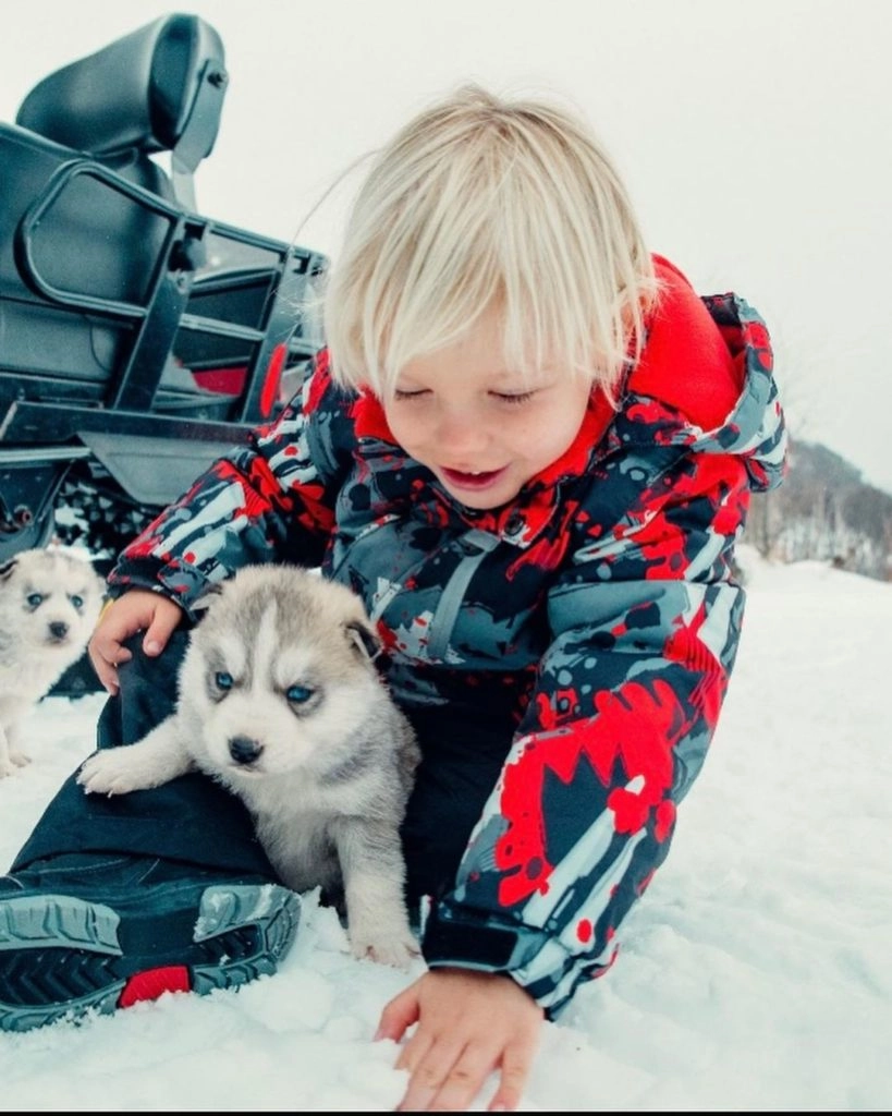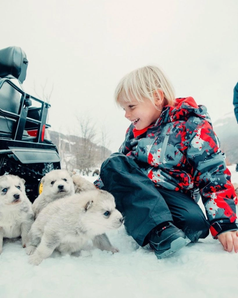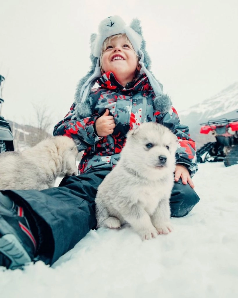 En la sesión fotográfica se lo puede ver jugando muy feliz con los perritos y luciendo un look invernal que llamó la atención por su adorable gorro. "Con los perros de nieve en Ushuaia", describe las imágenes.
