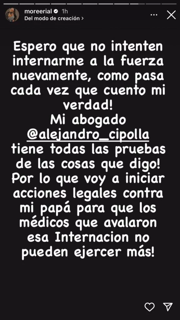 Luego de sus explosivas declaraciones contra Jorge Rial, Morena publicó un posteo en Instagram en el que aseguró que tomará cartas legales en el asunto. "Espero que no intenten internarme a la fuerza nuevamente, como pasa cada vez que cuento mi verdad! Mi abogado Alejandro Cipolla tiene todas las pruebas de las cosas que digo! Por lo que voy a iniciar acciones legales contra mi papá para que los médicos que avalaron esa internación no puedan ejercer más", aseguró.