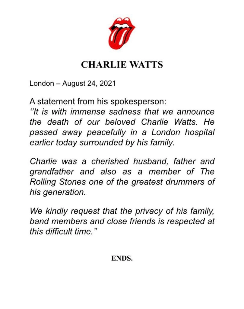 "Charlie fue un querido marido, padre y abuelo y también como miembro de los Rolling Stones uno de los bateristas más grandiosos de su generación", continuó el escrito.