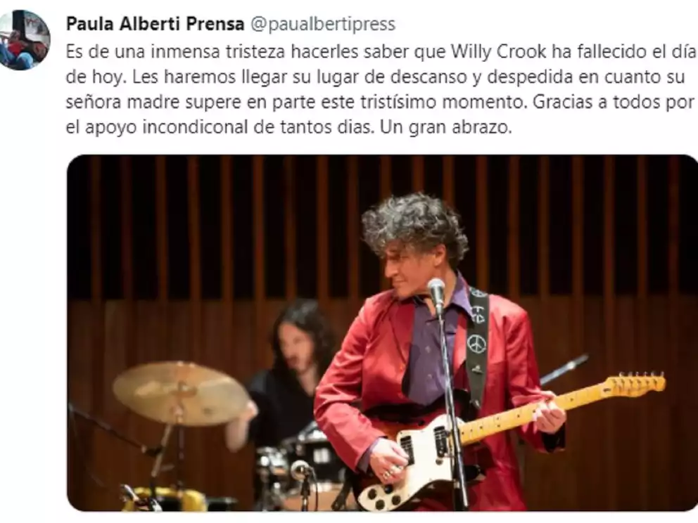 La triste noticia fue confirmada durante las últimas horas por Paula Alberti, su agente de prensa a través de las redes sociales: “Es de una inmensa tristeza hacerles saber que Willy Crook ha fallecido el día de hoy”.