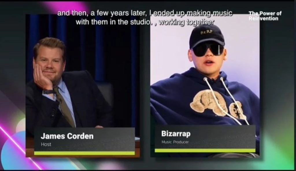 Bizarrap no para de crecer. Así lo demuestra una vez más en este encuentro internacional con el presentador del programa The Late Night Show, James Corden, en el evento "The Power Of Reinvention" de la empresa digital Globant, en donde hablaron sobre el recorrido musical que lo llevó a ser el artista en español más importante del momento, acumulando más de 3.300 millones de views en Youtube, 3000 millones de streams y 4 nominaciones a los Latin Grammy 2021.