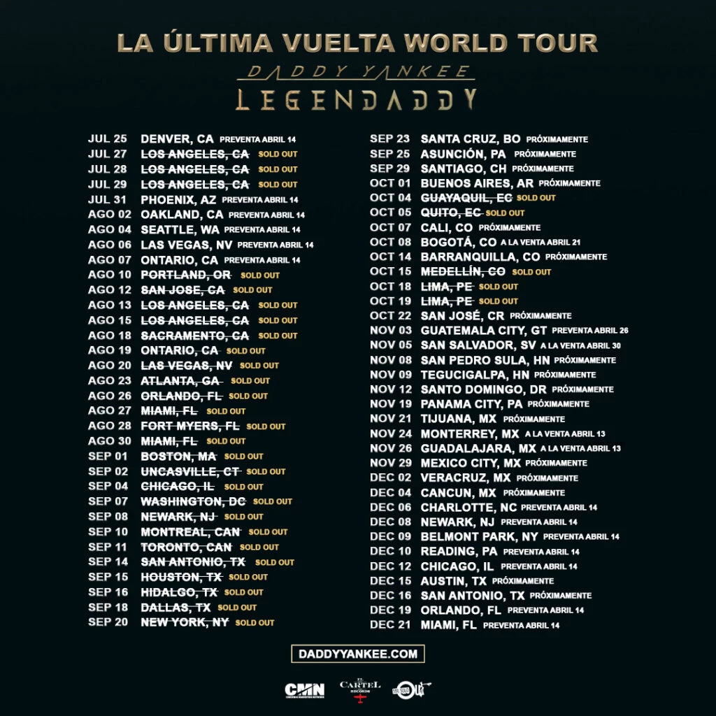 Por última vez, Daddy Yankee recorrerá el mundo en su gira de despedida “La última vuelta” que comenzará en Portland, Oregon en el Moda Center el 10 de agosto. La gira de cinco meses incluye algunos de los espectáculos principales más importantes de los raperos y compositores en América del Norte y América Latina hasta la fecha.