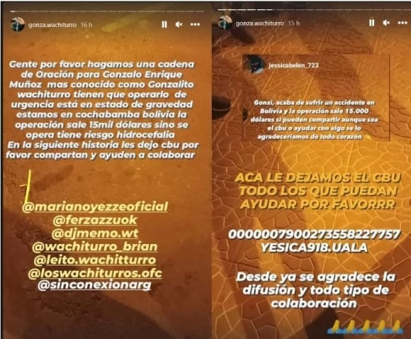 Ahora la banda y la familia del cantante piden ayuda para reunir 15 mil dólares para cubrir los gastos de la cirugía, que fue realizada de urgencia. Gonzalo tiene un coágulo en la cabeza y está con asistencia mecánica. Esperan ver su evolución para analizar si en las próximas horas le quitan el respirador artificial.