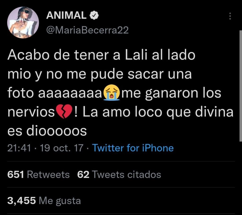 Becerra siempre fue una gran fan de la música de la ex Casi Ángeles. En 2017, cuando aún no era popularmente conocida, la trapera tuiteó "Acabo de tener a Lali al lado mío y no me pude sacar una foto, me ganaron los nervios. La amo loco, qué divina es Dios". Finalmente, cinco años más tarde, las cantantes se conocieron como pares y compartieron unos minutos en el camarín de la jurado.