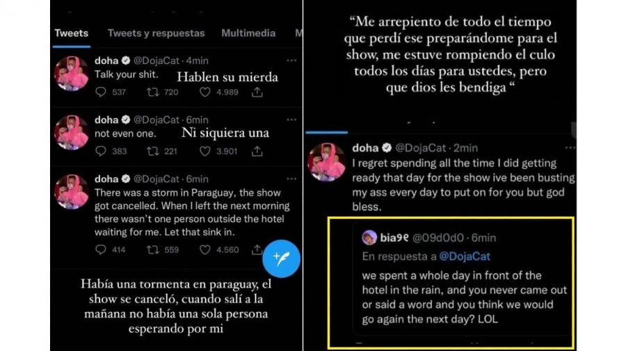 Además, Doja no se acercó a saludar a sus fans, quienes estuvieron al menos dos días bajo la lluvia esperándola frente al hotel. En ese contexto, la artista usó su Twitter para comentar que el concierto se canceló por la lluvia y que al día siguiente, cuando se despertó, no había nadie frente al hotel.