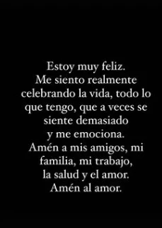Desde el relax de su hogar escribió a sus seguidores: "Estoy muy feliz. Me siento realmente celebrando la vida, todo lo que tengo, que a veces se siente demasiado y me emociona. Amén a mis amigos, mi familia, mi trabajo, la salud y el amor. Amén al amor".