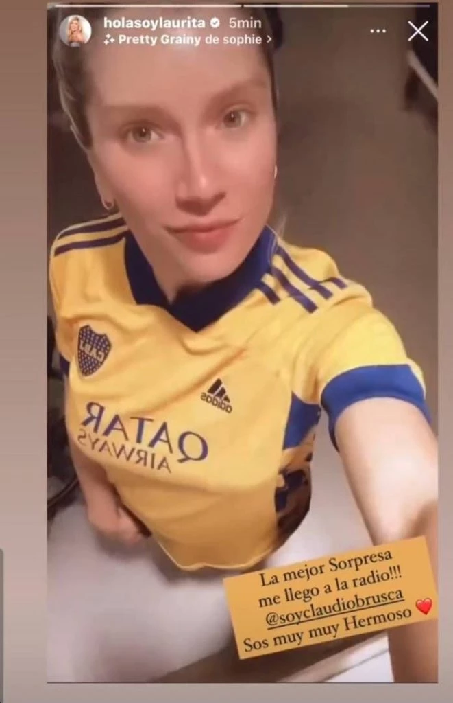 Laurita Fernández recibió en la radio un regalo sorpresa de parte de Peluca y publicó en sus historias de Instagram el agradecimiento. "La mejor sorpresa me llegó a la radio. Sos muy muy hermoso", escribió. Peluca le envió la camiseta de Boca Juniors, club del que es hincha Laurita.