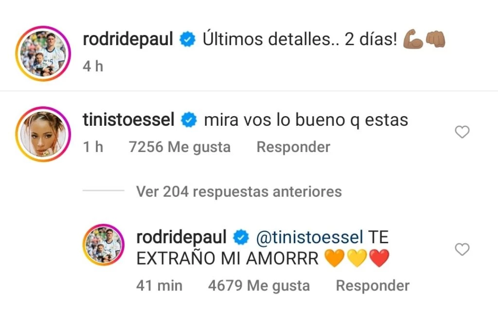 Luego de muchísimos meses de rumores sobre su romance, se confirmó la relación de la cantante Tini Stoessel y el jugador de fútbol Rodrigo De Paul. Comenzó con una foto de ambos cenando y luego fueron dejando mensajes en sus redes sociales indicando que todo marcha bien entre ellos.