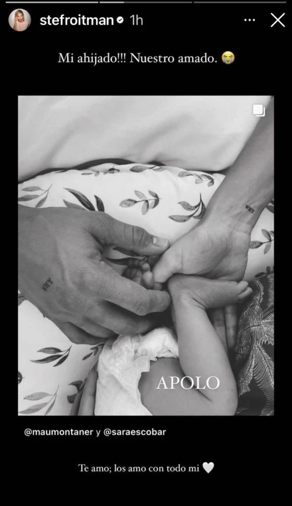 El más chiquito de la familia Montaner fue presentado en sociedad con una foto de su mano tomada por la de sus padres. Ambos escribieron "Apolo" junto a un emoji de corazón.