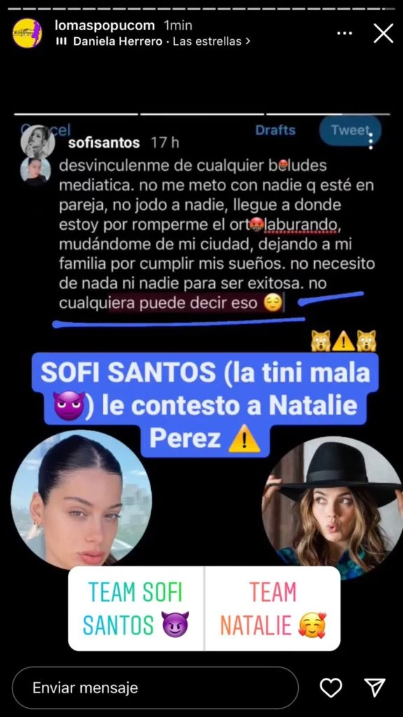 Por otro lado, la joven señalada, decidió hacer un descargo en sus historias de Instagram para desvincularse de cualquier acusación. "Desvinculenme de cualquier boludés mediática. No me meto con nadie que esté en pareja, no jodo a nadie. Llegué a dónde estoy por romperme laburando, mudándome de mi ciudad, dejando a mi familia por cumplir mis sueños. No necesito de nada ni nadie para ser exitosa. No cualquiera puede decir eso", expresó.
