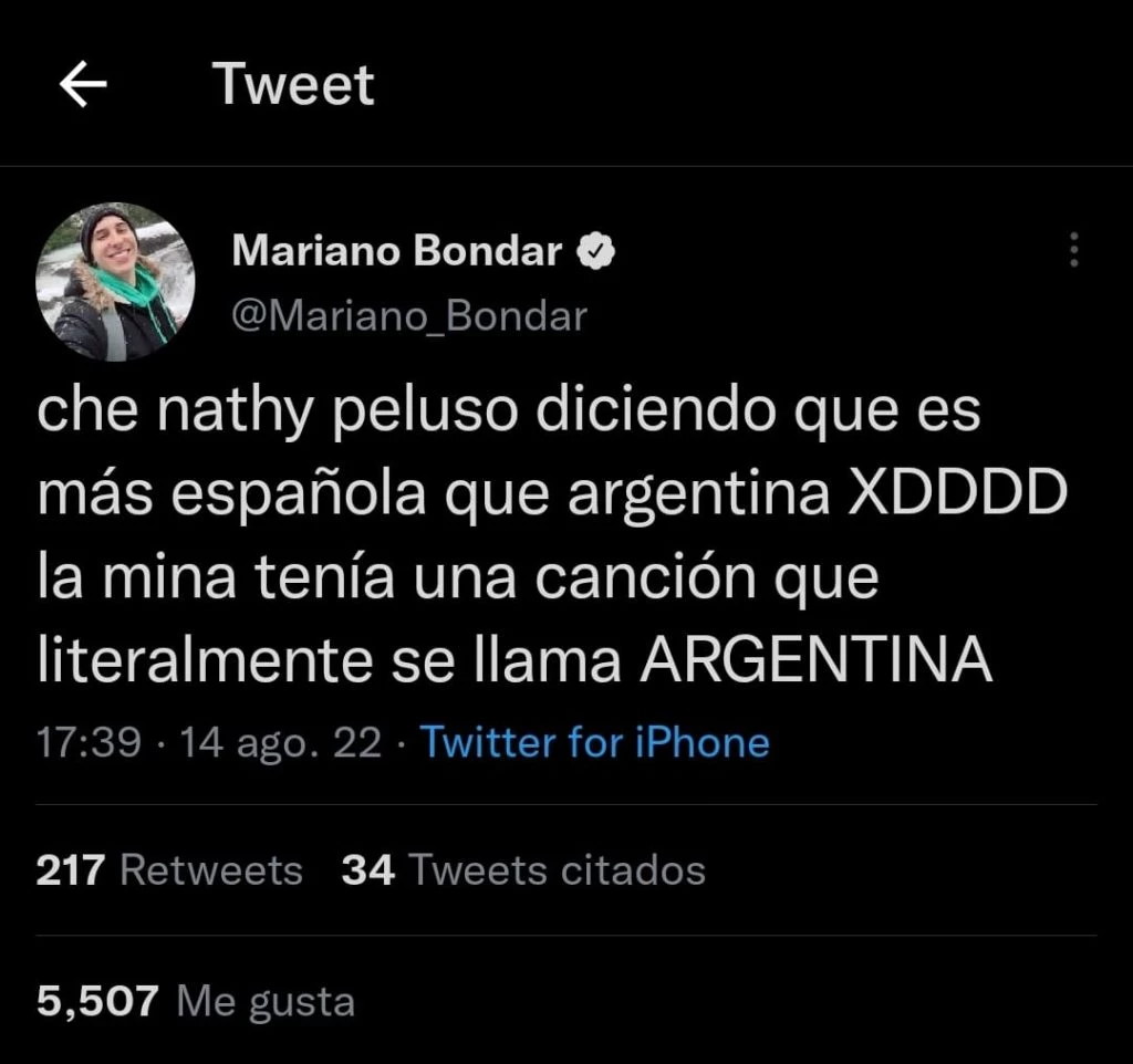 Estás declaraciones incendiaron las redes sociales y cientos de argentinos comenzaron a dejarle mensajes muy enojados. "Nathy Peluso hizo lo peor que pudo haber hecho, ofender a todo un país. Obviamente, no la culpo, la mayor parte de su vida la vivió en España, pero después de decir "Argenta como la negra sosa" y tener un tema llamado Buenos Aires y otro Argentina...", escribió un usuario. A lo que otro sumó, "¿Cómo vas a generar un sentido de pertenencia con un país que vino a saquear tu tierra y encima colonizó tu país?".