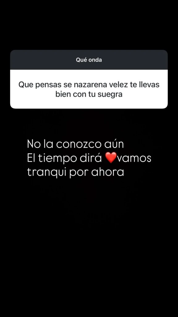Por su parte, la Tana también fue consultada en redes sociales sobre el vínculo con la familia de su pareja. Ante la pregunta de si ya conocía a Nazarena Vélez, respondió con cautela: “No la conozco aún. El tiempo dirá, vamos tranqui por ahora”. Una frase que fue en sintonía con el perfil bajo que ambos parecían querer mantener en esta etapa inicial del romance.