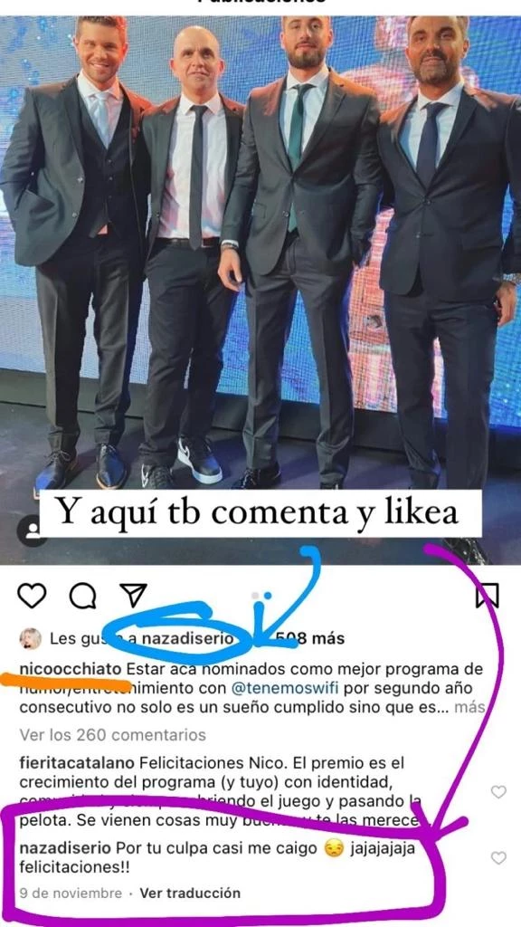 ¿Otro de sus intercambios? Esa misma noche, la compañera de Marcelo Bonelli le escribió al ex campeón de Bailando en una publicación en la que agradecía la nominación a Mejor Programa de Entretenimiento por Tenemos wifi la siguiente frase: “Por tu culpa casi me caigo, felicitaciones”.