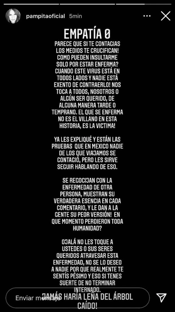 Pampita había hecho un reclamo público por la falta de empatía en la sociedad. "Empatía cero. Parece que si te contagias, los medios te crucifican. ¿Cómo pueden insultarme por estar enferma? ¡Cuando este virus está en todos lados y nadie está exento de contraerlo! Nos toca a todos, nosotros o algún ser querido, de alguna manera tarde o temprano. ¡El que se enferma no es el villano en esta historia, es la víctima!", escribió en una larga historia de Instagram y añadió: "Ya les expliqué y están las pruebas que en México nadie de los que viajamos se contagió, pero les sirve seguir hablando de eso. Se regocijan con la enfermedad de otra persona, muestran su verdadera esencia en cada comentario, ¡y le dan a la gente su peor versión! ¿En qué momento perdieron la humanidad?”.