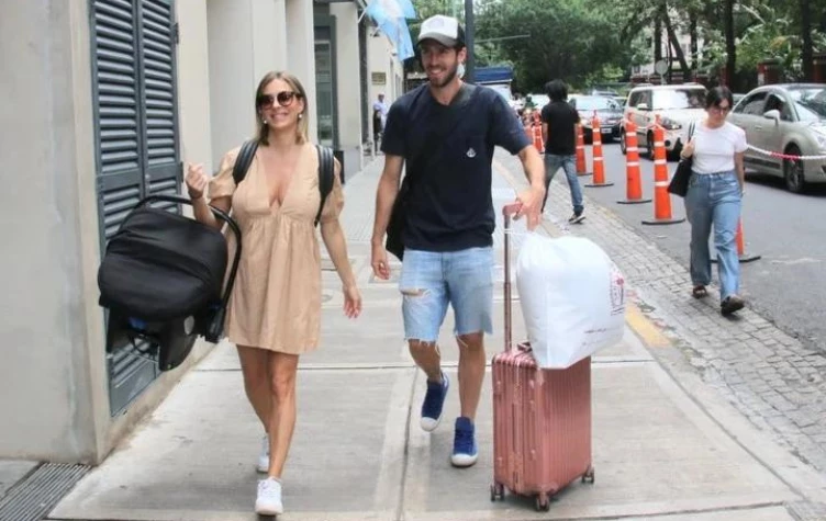 Al salir de la clínica, la bailarina eligió llevar un vestido amplio, escotado y hasta las rodillas en color nude. Además, lució unas zapatillas blancas para estar cómoda y respetando las últimas tendencias en calzado. Por su parte, Ramiro usó una bermuda de jean claro, con remera azul náutico y gorras y zapatillas.