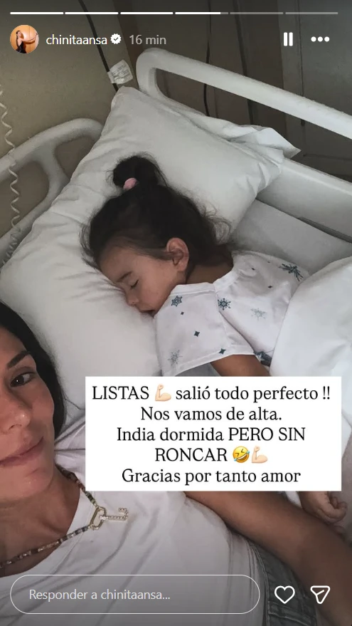 Horas más tarde, llegó el mensaje que llevó alivio a sus seguidores. Ya con la intervención finalizada, la periodista compartió una imagen desde la clínica, donde se la veía junto a su hija recostada y dormida. “LISTAS... salió todo perfecto!! Nos vamos de alta. India dormida PERO SIN RONCAR. Gracias por tanto amor”, escribió, confirmando que todo había salido según lo esperado.