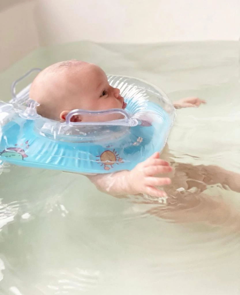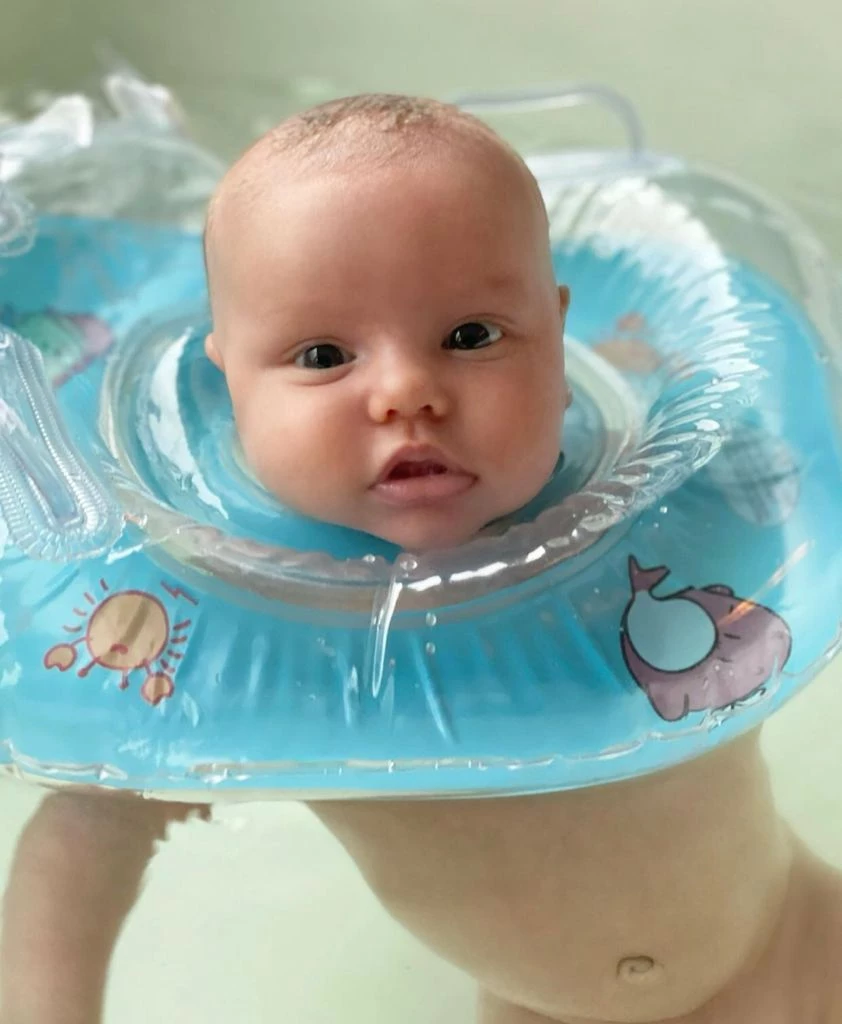 En las postales, la beba flota en la bañera con la ayuda de un salvavidas con motivos acuáticos y sostenida solo por la cabeza.