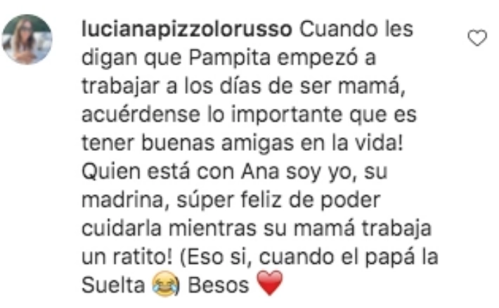 "Cuando les digan que Pampita empezó a trabajar a los días de ser mamá, acuérdense lo importante que es tener buenas amigas en la vida", respondió en Instagram Pizzolorusso ante la "polémica".