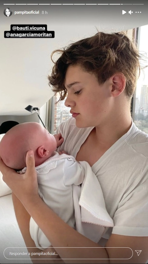Además, en sus historias compartió una imagen que retrata a la perfección el maravilloso vínculo que tiene su hijo Bautista, fruto de su ex relación con Vicuña, y su bebita. El adolescente de 13 años la sostiene en sus brazos mientras la mira fijamente con cierta dulzura y demostrando cuánto ama a su hermanita.