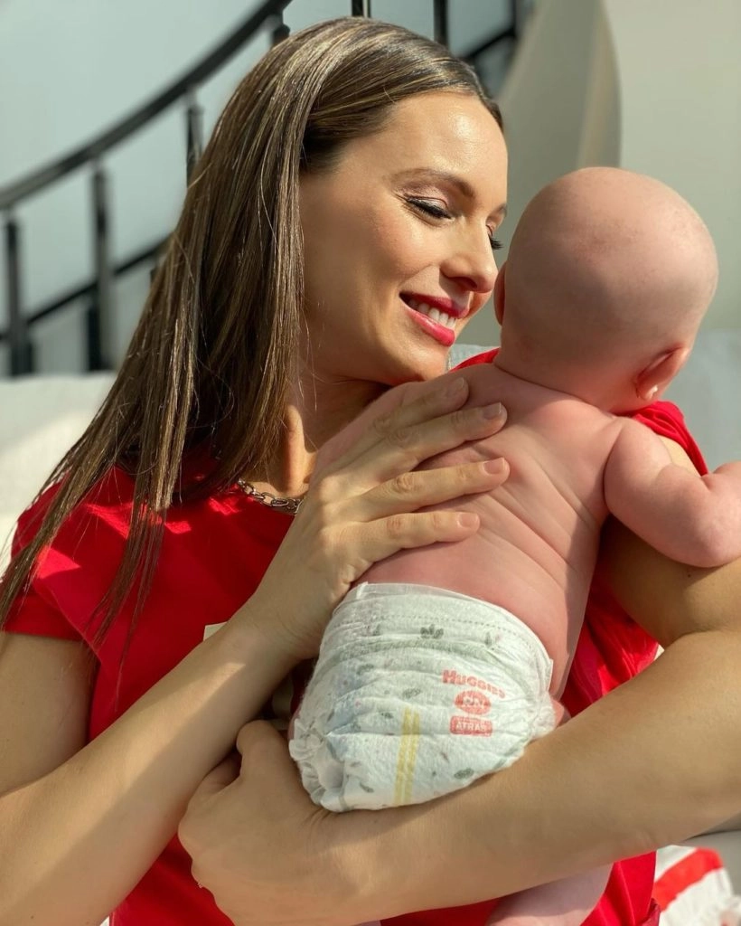 En dichas fotos se la ve luciendo un outfit total red, súper sonriente y feliz mientras sostiene en sus brazos a su pequeña, que sólo lleva puesto un pañal, y expresó: "Nada más lindo que los abrazos con Ana".