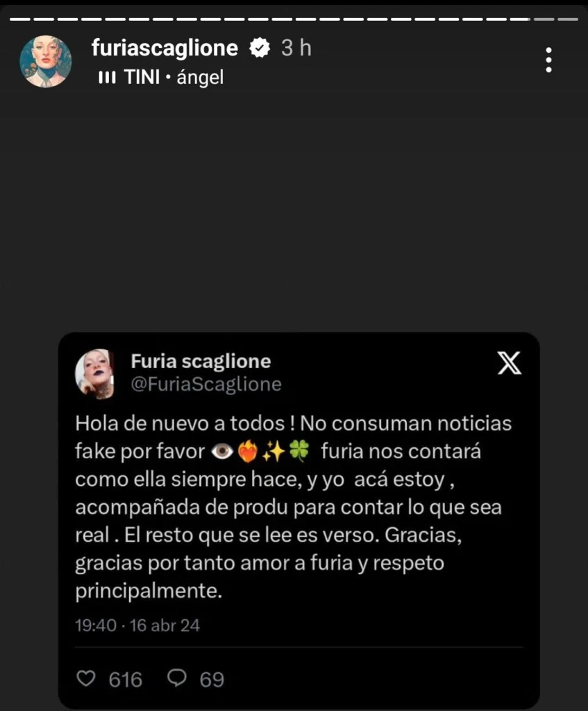 "Hola de nuevo a todos! No quiero que consuman noticias fake por favor. Furia nos contará como ella siempre hace, y yo acá estoy, acompañada de produ para contar lo que sea real. El resto que se lee es verso", indicó la hermana mayor de Furia.