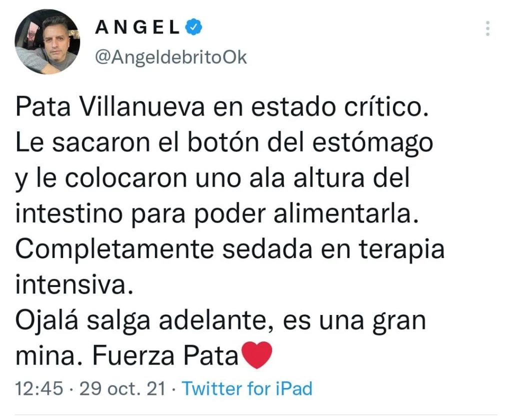 Desde su cuenta de Twitter, De Brito amplió la información y comentó: "Le sacaron el botón del estómago y le colocaron uno a la altura del intestino para poder alimentarla. Completamente sedada en terapia intensiva". Y cerró: "Ojalá salga adelante, es una gran mina. Fuerza Pata".