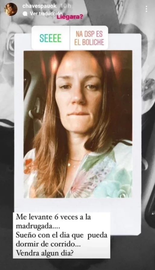 En sus historias de Instagram, la pareja de Pedro Alfonso publicó una selfie que se tomó en el auto con cara de hartazgo y explicó por qué se encontraba de mal humor. "Me levanté seis veces a la madrugada... Sueño con el día que pueda dormir de corrido, ¿vendrá? ¿Sí o después viene el boliche?", escribió a pura ironía.
