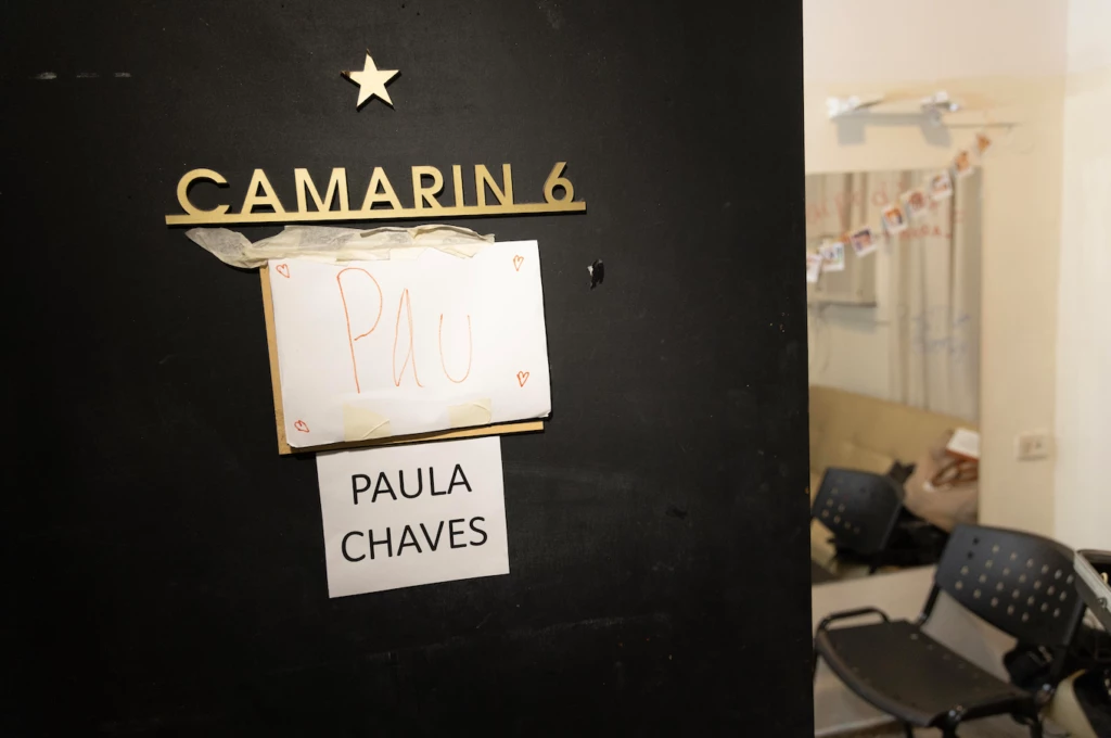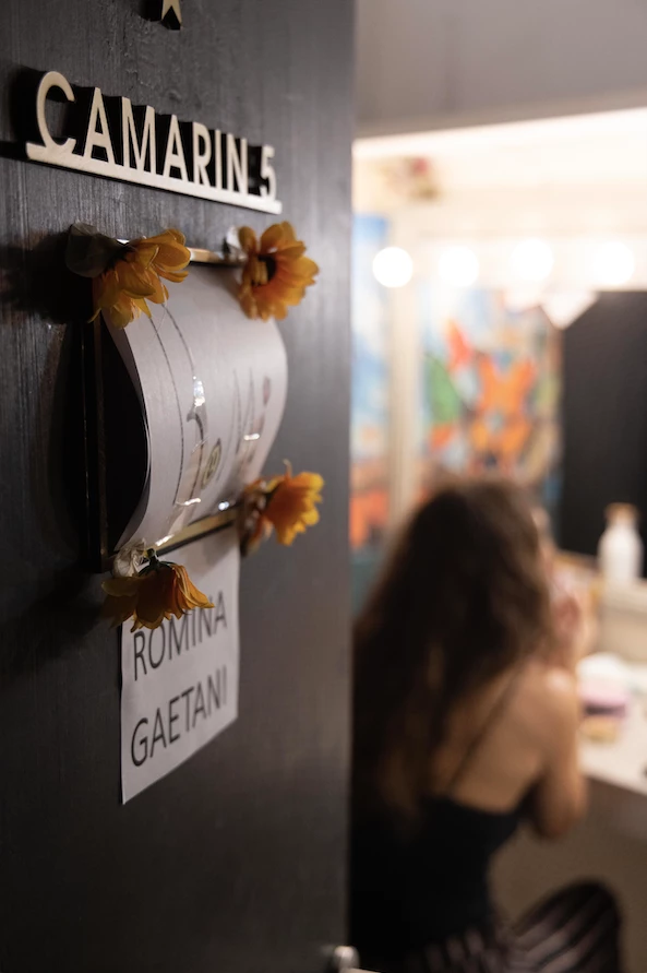 Debajo de las letras que indican que estamos accediendo al Camarín Nº5, hay un cartelito que dice “Romi” con cuatro flores amarillas en sus esquinas. “Lo hizo Olivia, la hija de Pedro y Paula, que es toda una artista”, nos explica Romina Gaetani antes de poner en pausa la canción que está escuchando en Spotify: Nueva Luna, Mundo Arjo.