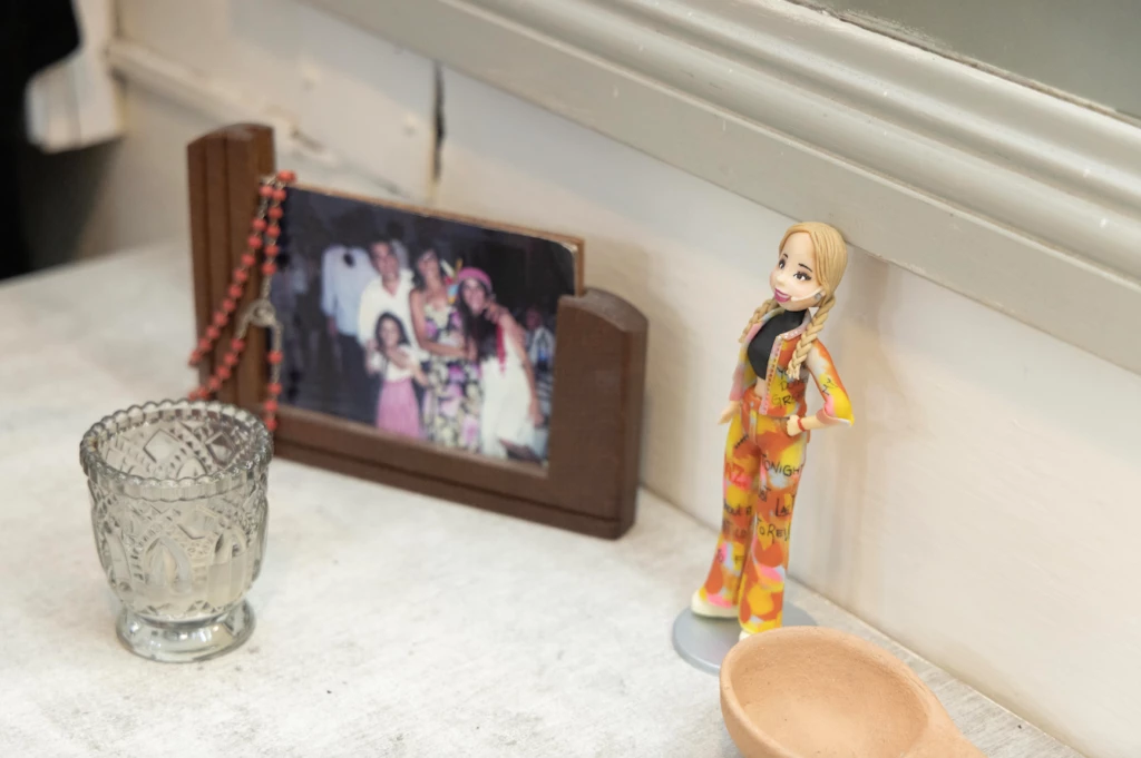 Acá tengo una especie de altar con una foto de mi familia, un rosario, una velita y una muñequita: supuestamente soy yo encarnando a Mia, mi personaje en la obra. Me la regaló una chica muy dulce a la salida del teatro