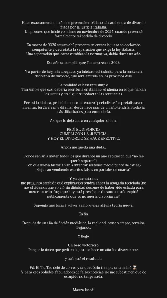 A través de su cuenta de Instagram, Icardi aseguró que el proceso legal siguió los pasos establecidos por la ley italiana y sostuvo que el divorcio ya es un hecho.