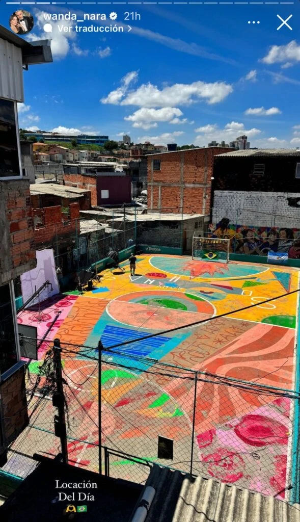 La empresaria, artista y conductora se mostró junto a su staff caminando por los pasillos de la favela, luciendo un short deportivo verde, zapatillas blancas y la camiseta argentina. Además, mostró la locación del clip: una canchita de fútbol bien colorida en el centro del asentamiento.