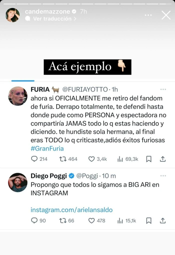 Según mostró la periodista Cande Mazzone, desde una de las cuentas que apoyaban a Juliana anunciaron: "Ahora sí, oficialmente me retiro del fandom de Furia. Derrapó totalmente, te defendí hasta donde pude. Como persona y espectadora no compartiría jamás todo lo que estás haciendo y diciendo. Te hundiste sola hermana, al final eras todo lo que criticaste. Adiós, éxitos furiosas".