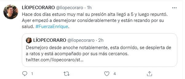 “Hace dos días estuvo muy mal, su presión alta llegó a 5 y luego repuntó. Ayer empezó a desmejorar considerablemente y están rezando por su salud”, escribió esta tarde.