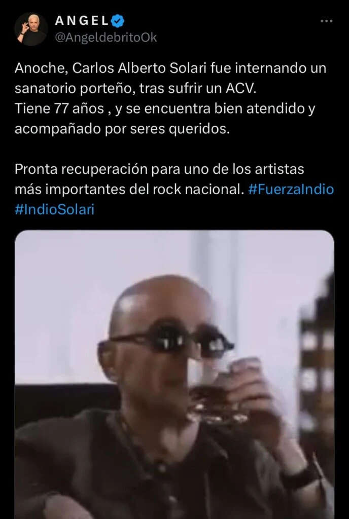 A través de su perfil @AngeldebritoOk, el conductor de LAM había expresado: "Anoche, Carlos Alberto Solari fue internando un sanatorio porteño, tras sufrir un ACV. Tiene 77 años , y se encuentra bien atendido y acompañado por seres queridos. Pronta recuperación para uno de los artistas más importantes del rock nacional. #FuerzaIndio #IndioSolari".