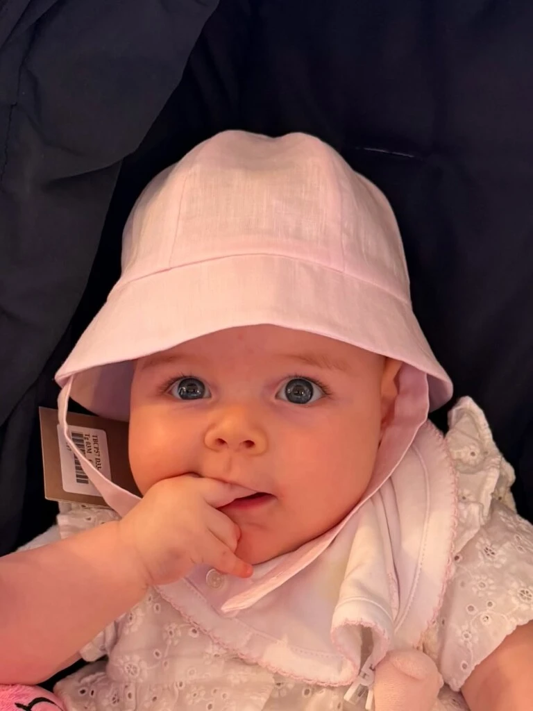 Sus mejillas sonrojadas y su expresión tranquila y curiosa evidencian que irradia ternura y que disfruta de un ambiente cálido y amoroso. Su mamá, Elina, se ve muy feliz y orgullosa, compartiendo este momento especial juntas.